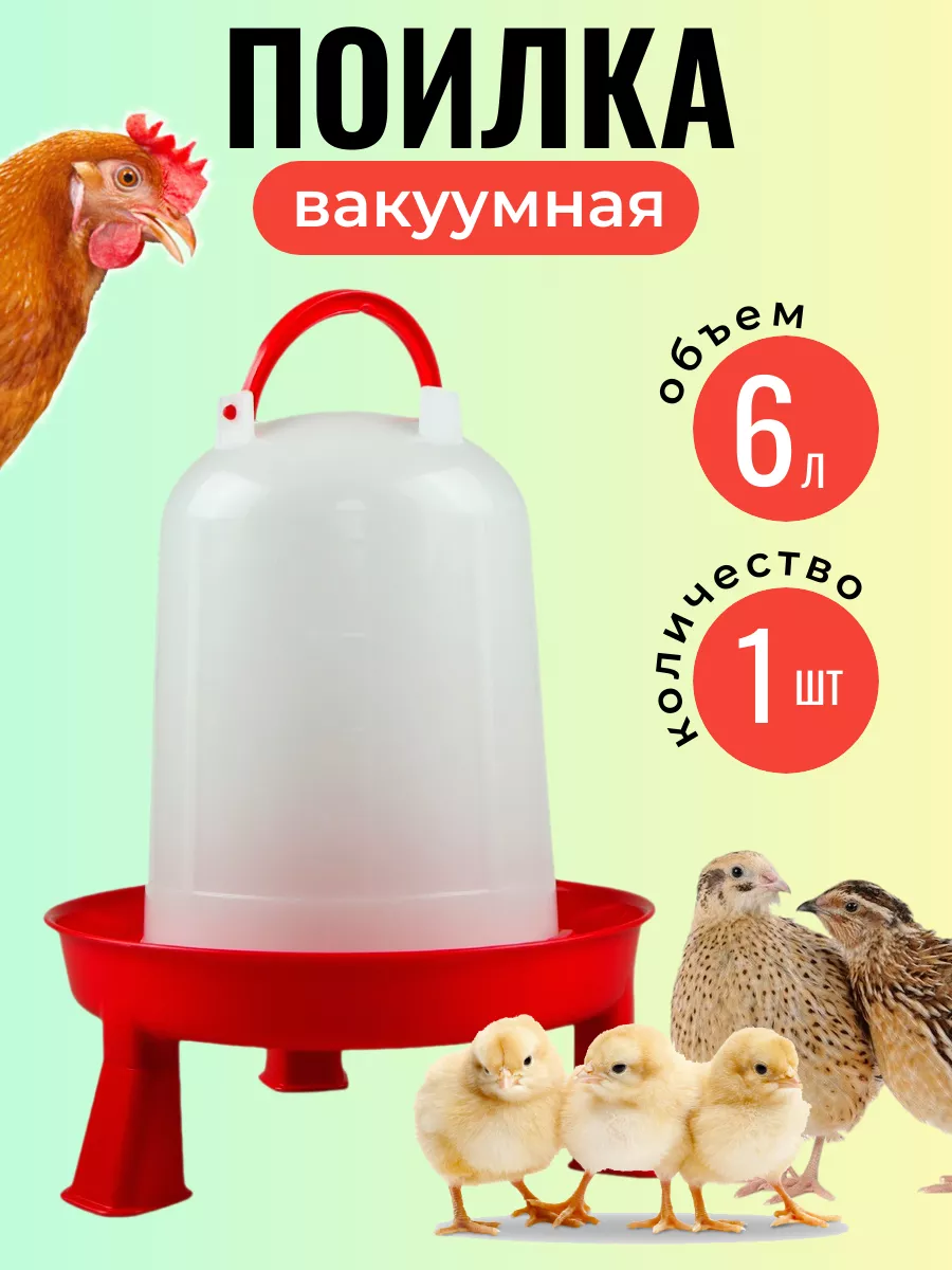 Вакуумная поилка объемом 6 литров, работает по принципу вакуума - ёмкость необходимо наполнить водой, плотно состыкуйте поддон с резервуаром и переверните всю вакуумную поилку, приводя ее в рабочее положение. Давление, образовавшееся в поилке, будет препятствовать вытеканию воды, удерживая ее на требуемом уровне в поддоне. Поилка для птиц состоит из: резервуара для воды, поддона и 3-х ножек. Материал изготовления - прочный пластик, устойчивый к перепаду температур.