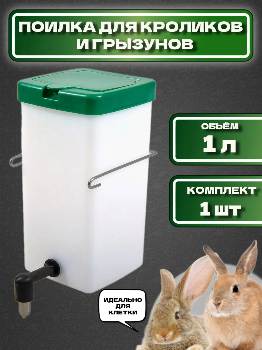 Ниппельная поилка в клетку с бачком объемом 1 литр, для кроликов, для грызунов, для хомяков, для шиншилл, для морской свинки, для крыс. из пластика и нержавеющей стали. Поильник разборный, состоит из бачка и удлинителя 4 см с ниппелем поения. Крепится металлической скобой, непосредственно на сетку клетки. Бачок располагается с наружной стороны клетки вне доступа для животных. Удлинитель с ниппелем поения направляется во внутрь клетки и угол его наклона составляет 90 градусов.